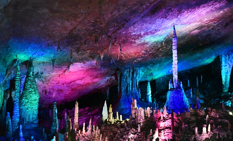 張家界武陵源的黃龍洞,號稱世界溶洞奇觀,今年九月份,我懷著探秘的心境前來欣賞。洞內(nèi),頭一段路較為平坦,約百米,漸漸踏上了石階,燈光灰暗,眼前的一切都顯得模糊,導(dǎo)游小邱說洞中有幾層,展現(xiàn)在眼前的是一個(gè)豪華的“歌舞廳”,我想那龍王和他的子孫們在重要的節(jié)日定然在這舞廳展示風(fēng)采吧!殿堂里燈光不停的閃爍,色彩斑闌,隱隱約約看見它的小女兒正在與情人約會,手牽手低低切切,情意綿綿……這個(gè)大廳名曰:“龍舞廳”,之外,還有天堂宮、天仙宮、后宮、龍宮……