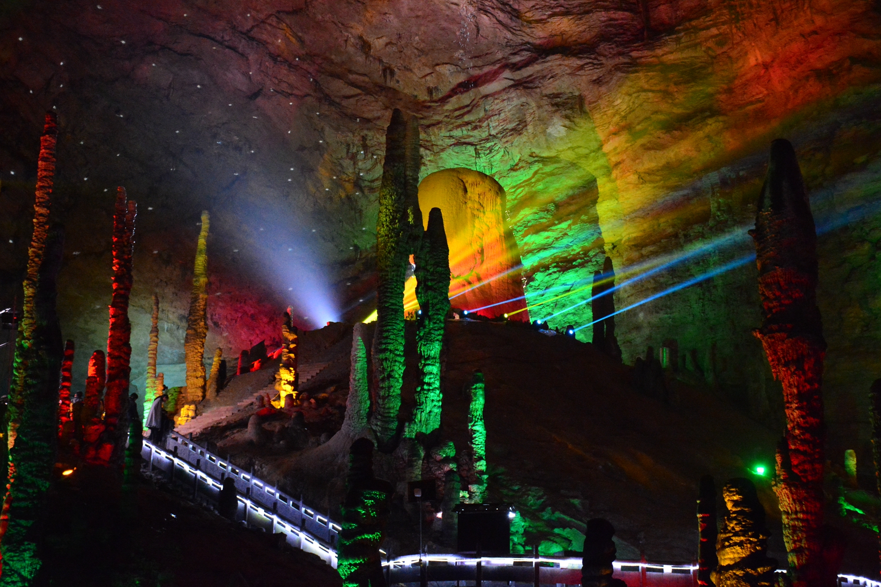 黃龍洞,一座形成于3.8億年前的大自然的迷宮,高闊的洞天,幽深的暗河,懸空的瀑布,密集的鐘乳石,匯聚成氣勢雄偉的洞穴大觀。目前,黃龍洞已探明的洞底總面積是10萬平方米,全長7.5公里,垂直高度140米,內(nèi)分兩層旱洞和兩層水洞。