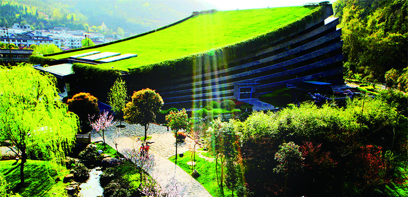 音樂廳與黃龍洞相毗鄰,背靠植被茂密的黃龍洞山體,面朝廣闊田園,南鄰潺潺東流的索溪水,音樂廳屋頂被綠蔭花草覆蓋,綠化面積達3000平方米,是我國目前最大的單體斜坡綠化屋頂,也是世界上唯一的一家生態(tài)劇院。音樂廳外墻由張家界青石頁巖構建成的音符弦線幕墻與自然融合一體,如同一本即將展開等待世人閱讀的張家界文化寶典,又如鑲嵌在張家界的一塊翡翠。