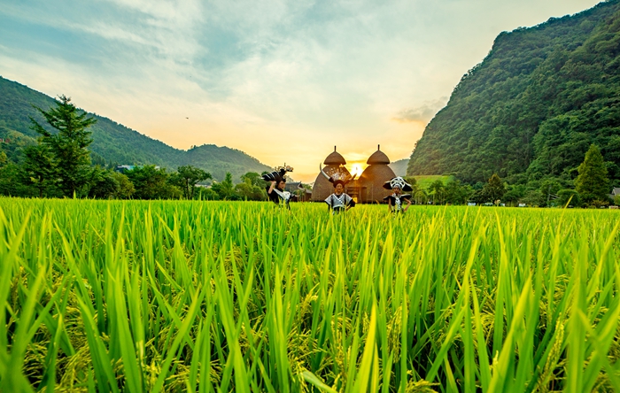 9月19日,在湖南省張家界市武陵源區(qū)黃龍洞景區(qū)生態(tài)稻田,景區(qū)工作人員身著民族時尚服飾在金黃的稻田間走秀,